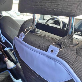 The organizer is pretty easy to put on. Perfect for a medium sized crossover. Sewn carefully, materials and fastenings are good. 8 pockets and two hooks for all your kid’s travel essentials. The organizer fits snugly to the back and keeps quite securely on the road even if you kick it. The bottom is made to protect the upholstery from children’s shoes as well. We traveled to another city in rainy weather and our daughter left a lot of dirt on it. Everything was washed off in a minute with a damp cloth, no traces remained! I’m satisfied with my purchase!